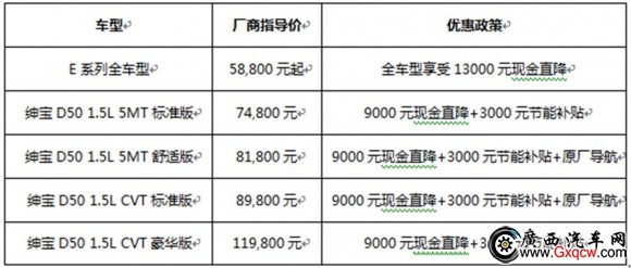 一重現(xiàn)金禮,現(xiàn)金直降最劃算。在眾多優(yōu)惠政策中,屬“現(xiàn)金直降”最具吸引力,此次北京汽車(chē)將一降到底,購(gòu)買(mǎi)E系列全車(chē)型即享“直降1.3萬(wàn)元”的優(yōu)惠價(jià)格;紳寶D50 1.5L 指定四款車(chē)型,更享現(xiàn)金直降9000元外加3000元節(jié)能補(bǔ)貼,綜合優(yōu)惠*高達(dá)1.2萬(wàn)元,部分車(chē)型還重磅加裝“原廠導(dǎo)航”,增配不加價(jià),要多超值有多超值。