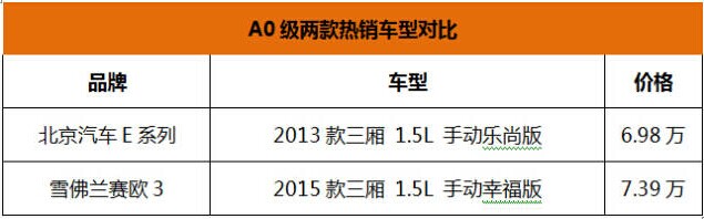 而近期,隨著雪佛蘭賽歐3的改款上市,憑借著更加時尚的造型與加長的空間,又迅速吸引了更多A0級市場潛客的關注。其實在小編看來,無論是自主還是合資、小E還是賽歐3,消費者買A0級車,最關注的還是該車能否滿足自己的用車需求。E系列與賽歐作為A0級市場中自主與合資品牌的領頭羊,常被拿來比較。今天小編就針對誰更值得購買的問題,來為大家找一找答案!