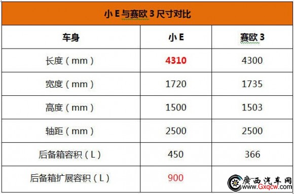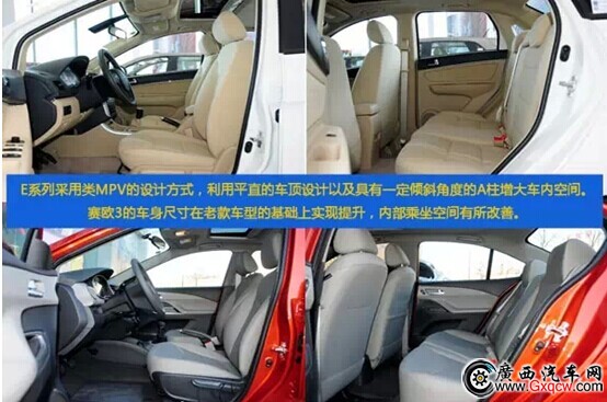 在乘坐空間方面,賽歐3的車身尺寸在老款車型的基礎上有顯著提升。與小E相比,在同軸距的情況下,其高度和寬度略勝一籌,使內(nèi)部乘坐空間有所改善。小E則以科學、人性化的設計增大車內(nèi)空間,采用了類MPV的設計方式,利用平直的車頂設計以及具有一定傾斜角度的A柱,為前后排乘客提供了充足的頭部和腿部活動空間,使駕乘人員絲毫不會有局促感。