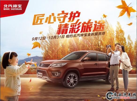 為回饋廣大新老客戶, 2017年9月12日-2017年10月31日,北汽紳寶南寧新源4S店開(kāi)展“匠心守護(hù) 精彩旅途“秋季服務(wù)月活動(dòng),用八重好禮確保每一位車主享受貼心服務(wù),擺脫后顧之憂,安心出行。