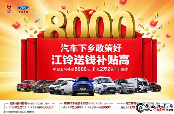 盡管有關(guān)部門還未啟動“汽車下鄉(xiāng)”具體補貼措施,但江鈴汽車積極響應(yīng)政策號召,推出了官宣版的惠民補貼政策。江鈴汽車旗下輕客、皮卡、輕卡都可以享受超低首付或者高額現(xiàn)金優(yōu)惠,為消費者購車、換購帶來實實在在的“省錢”大招。