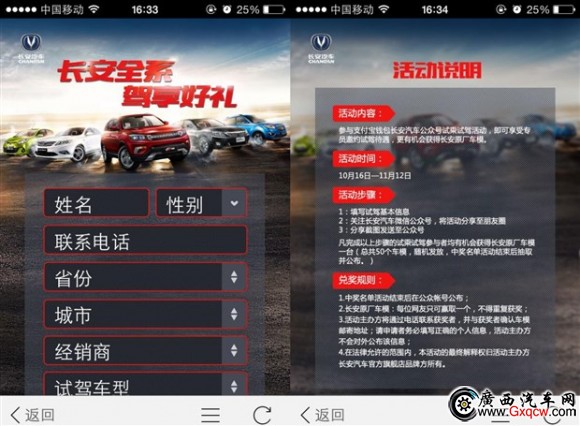 活動四、試駕即有禮,轉(zhuǎn)發(fā)亦有禮——長安全系 駕享好禮 關(guān)注手機(jī)支付寶錢包長安汽車公眾號,動一動手指,填寫基本信息,即可享受專員邀約試駕體驗(yàn),更有機(jī)會獲得原廠車模一臺,微信分享活動,也有機(jī)會獲贈車模一臺。