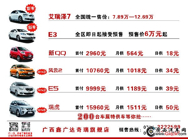 9月13日至9月15日北部灣車展將在南寧國際會展中心舉行,廣西鑫廣達奇瑞旗艦店攜奇瑞全系亮相北部灣車展現(xiàn)場,在J9展位給您帶來奇瑞瘋狂“價”日,****讓利3億!我敢送,您“趕”來!
