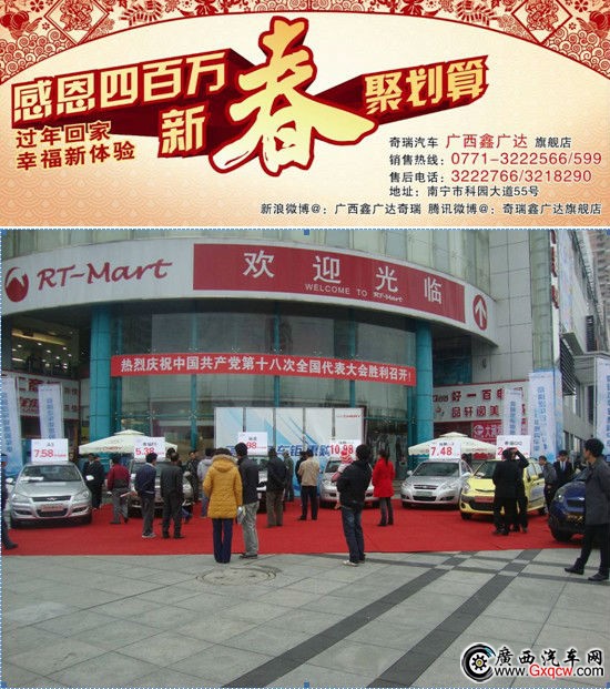 12月12日奇瑞汽車攜旗下全系品牌在江南南城百貨購物廣場舉行了“奇瑞汽車鉅惠購車季”南寧站。本次活動是暨東盟(南寧)國際車展后奇瑞汽車又一次集體亮相,活動期間進(jìn)行了訂車有禮、購車有驚喜及多種現(xiàn)場免費(fèi)客戶互動游戲等豐富多彩的項(xiàng)目。最終活動現(xiàn)場取得了成交了8臺現(xiàn)車、客戶預(yù)定4臺展車的優(yōu)異表現(xiàn),活動取得圓滿成功…………