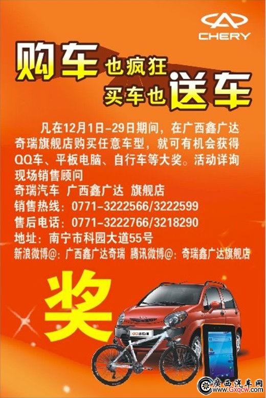 12月29日,奇瑞汽車廣西鑫廣達(dá)旗艦店新風(fēng)云2升級(jí)上市發(fā)布會(huì)”。新風(fēng)云2以“為愛進(jìn)取”為品牌訴求,憑借其動(dòng)感外形、靈動(dòng)空間、安全備至和豐富配置等核心優(yōu)勢(shì),再次引發(fā)了市場(chǎng)和消費(fèi)者的廣泛關(guān)注,以及我們年末沖鉆購(gòu)車也瘋狂 買車也送車,抽QQ抽平板電腦