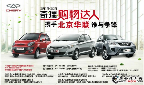 參賽資格:凡3月1-30日在廣西鑫廣達旗瑞各門店購奇瑞汽車任一款車型,即可參賽。
