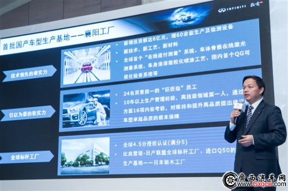 英菲尼迪國產(chǎn)車型踐行“統(tǒng)一標(biāo)準(zhǔn),同一品質(zhì)”的承諾。而國產(chǎn)車型生產(chǎn)基地襄陽工廠多次榮獲“雷諾-日產(chǎn)聯(lián)盟**標(biāo)桿工廠”殊榮,并于2014年3月獲得英菲尼迪**4.5分的授權(quán)認(rèn)證(滿分5分),比肩雷諾-日產(chǎn)聯(lián)盟**標(biāo)桿工廠、進(jìn)口Q50的生產(chǎn)基地——日本櫪木工廠。