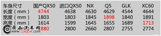 我們?cè)跈M向比較了一下配置接近的Q5、GLK和NX這類對(duì)手之后,得出的結(jié)論是:國產(chǎn)QX50的配置水平還是相當(dāng)高的。軟肋當(dāng)然也有:缺乏諸如先進(jìn)的人車交互系統(tǒng)、自動(dòng)駐車等高科技配置,以及滿足更多越野需求的陡坡緩降、上坡輔助也缺席。除此之外,配置上沒有什么硬傷。