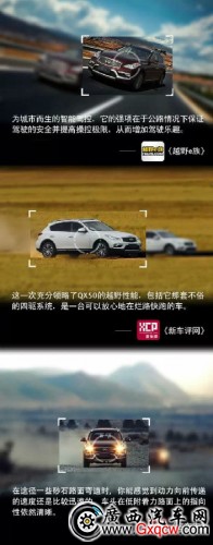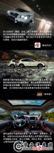 全新QX50,無(wú)論公路、紅毯、T臺(tái)、影棚,都是焦點(diǎn)人物。顏值高、有實(shí)力,就是這么自信!