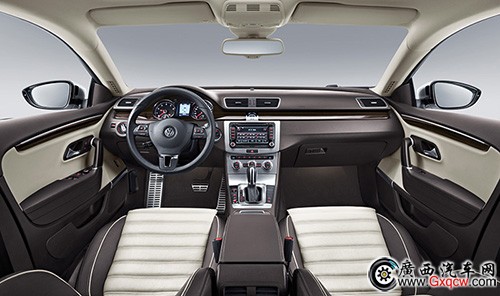 CC新增的黑白雙色內(nèi)室設(shè)計與朱鷺白的車身顏色形成呼應(yīng)。和外觀相比,CC的內(nèi)在變化并不顯著,典型的大眾風(fēng)格,簡潔、易用、不錯的品質(zhì)感。