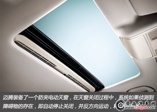 邁騰裝備了一個防夾電動天窗,在天窗關(guān)閉過程中,系統(tǒng)如果偵測到障礙物的存在,即自動停止關(guān)閉,并反方向運動,釋放障礙物。