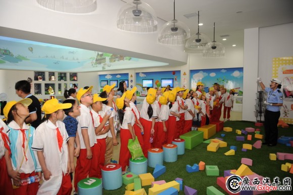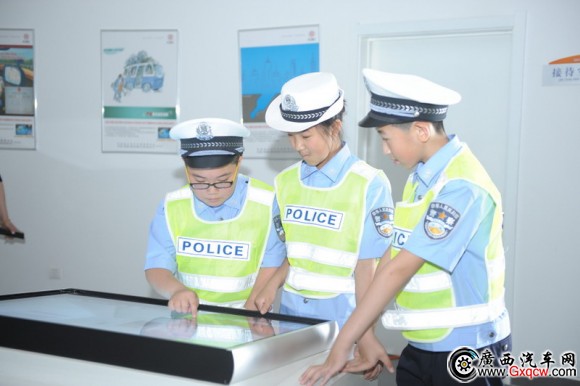 身著制服的小學(xué)生們在互動(dòng)區(qū)內(nèi)利用多媒體設(shè)備學(xué)習(xí)交通法規(guī)