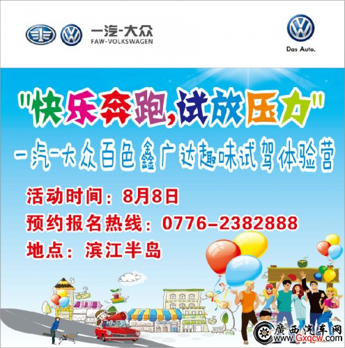 8月8日一汽-大眾車友會(huì)活動(dòng)正式啟動(dòng),開(kāi)展“快樂(lè)奔跑,試放壓力”一汽-大眾趣味試駕體驗(yàn)營(yíng),讓您不僅免費(fèi)享受試駕樂(lè)趣,更有豐富有趣的互動(dòng)游戲, DIY燒烤等著您,總經(jīng)理現(xiàn)場(chǎng)簽售,價(jià)格由你說(shuō)!購(gòu)車更有機(jī)會(huì)贏取泰國(guó)游大獎(jiǎng),機(jī)會(huì)不容錯(cuò)過(guò)。