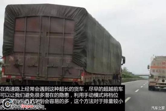 在高速公路行駛時,經(jīng)常會遇到車身很長的重型貨車,這個時候如果 我們可以盡早的超越前車,可以避免很多隱患,大排量車 型(比如3.5-4.0L)此時如果深踩油門進(jìn)行超越相對還容易一些,但小排量車型如果要快速超越這種大型貨車就會顯得底氣不足了,這時就可以利用手動模式降 低擋位后再超車。