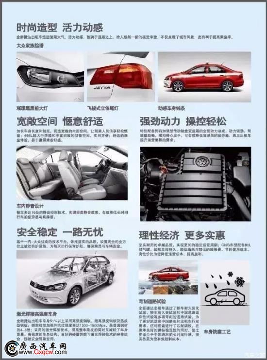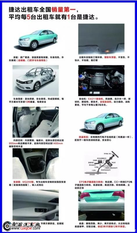 的的哥的姐們想多賺錢嗎?還不趕快換捷達出租車。捷達出租車“高、大、強、多、好”的五大優(yōu)勢便逐漸深入人心。“高”-- 平臺高、科技含量高、安全系數(shù)高;“大”-- 車身大、內(nèi)部空間、行李箱空間大;“強”-- 車身剛度強、動力性強、操控性強;“多”-- 便利、針對性設計多、產(chǎn)品驗證多;“好”-- 制動效果好、口碑、工藝、服務好。