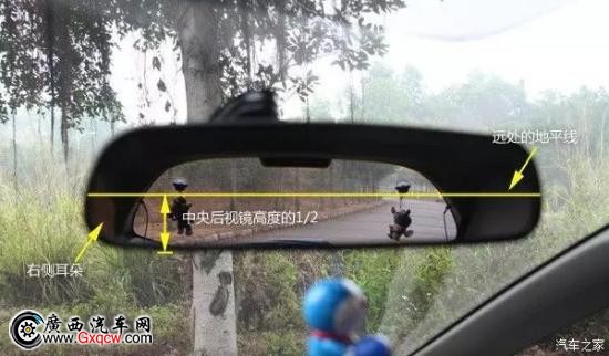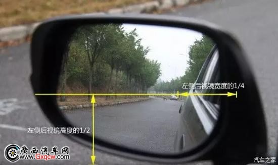 使右側(cè)車身映像占據(jù)鏡子左側(cè)的四分之一區(qū)域。遠(yuǎn)處的地平線位于鏡子的中央。