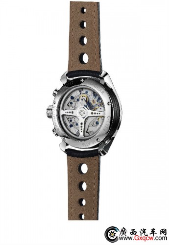 透過(guò)43毫米表徑MKI背面的藍(lán)寶石透明底罩,可以看到精雕細(xì)刻的BWC/01自動(dòng)上鏈機(jī)芯,當(dāng)然,還有這款手表最迷人的一個(gè)特性:一個(gè)精致的捷豹E-Type三輻方向盤形狀的自動(dòng)上鏈擺陀。