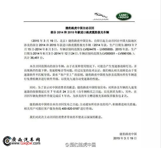 捷豹路虎中國(guó)在3月19日20:30分左右通過(guò)@捷豹路虎中國(guó)官方微博發(fā)布《捷豹路虎中國(guó)主動(dòng)召回部分2014和2015年款進(jìn)口路虎攬勝極光車輛》公告,全文如下: