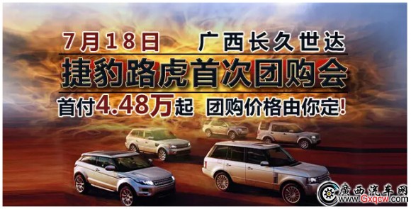 7.18廣西長(zhǎng)久世達(dá)捷豹路虎首次團(tuán)購(gòu)會(huì) 團(tuán)購(gòu)價(jià)格由你定!八重大禮等你來拿!
