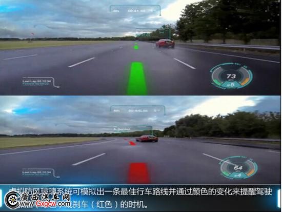 創(chuàng)新的平視系統(tǒng),采用激光全息技術將一系列信息投射到攬勝極光的擋風玻璃上。諸如:車速,檔位,導航,交通標志識別,巡航控制速度和狀態(tài)等等。
