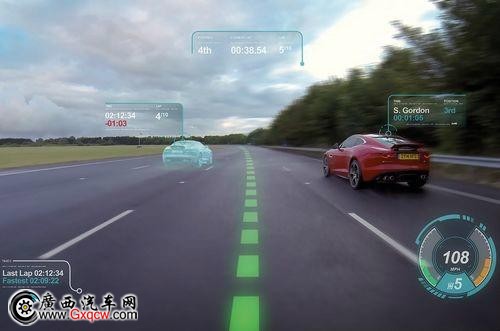 接下來就是JLR的虛擬擋風玻璃技術,不同于傳統(tǒng)汽車,只占用前擋風玻璃部分占用一小塊地方來顯示車輛行駛信息,JLR系統(tǒng)的設計有意將目前的抬頭顯示技術HUD擴大到整個前風擋玻璃上,該技術能夠實現(xiàn)不同的行車所需信息譬如衛(wèi)星導航、危險預警以及傳統(tǒng)儀表盤上會顯示的車速、轉速等信息全部整合,并投射到玻璃屏幕上。有JLR的工程師說,在進行尾隨行駛過程中,該系統(tǒng)甚至能夠顯示正確的路線和剎車地點甚至是給駕駛者模擬出一條行車線路。