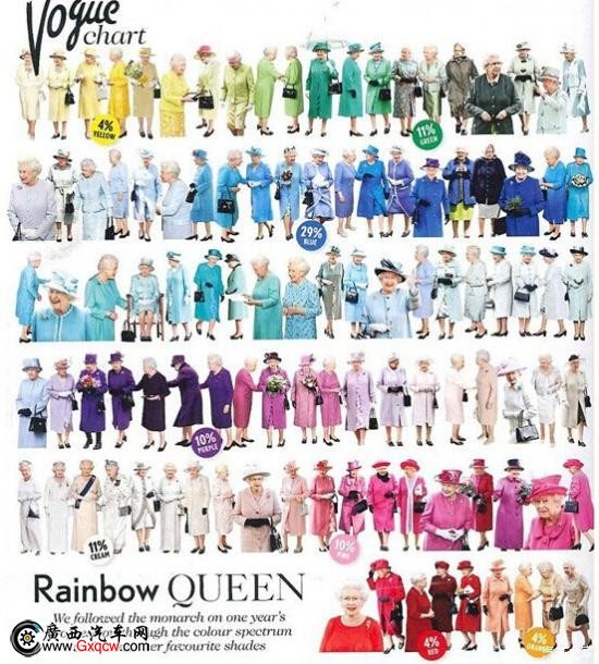 女王的藍(lán)色情懷——英國伊麗莎白女王在位已經(jīng)60年,出訪和外出旅行的次數(shù)多達(dá)數(shù)千次。對于女王外出時的著裝,英國老百姓一直津津樂道。經(jīng)過對女王過去 12個月每次外出時的著裝進(jìn)行統(tǒng)計,《Vogue》雜志發(fā)現(xiàn)伊麗莎白女王擁有很高的著裝品位,同時擁有獨(dú)特的喜好。統(tǒng)計結(jié)果顯示伊麗莎白女王29%的外 套、裙裝和帽子采用藍(lán)色,例如水鴨藍(lán)、深藍(lán)色或者粉末藍(lán),最不喜歡的顏色則是米黃色和格子圖案。藍(lán)色是代表皇族的顏色,英女王的著裝偏好便是一個**的體 現(xiàn)。