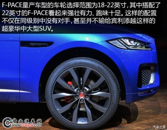 怎樣可以令車輛看起來強壯有力?超大號的車輪是個不錯的選擇。盡管無法和C-X17概念車上那一套23英寸的“大腳”相比,但F-PACE量產版本22英寸的車輪在同級別中絕對首屈一指。我們曾經問過嚴凱倫,為量產車型匹配這么大的車輪會不會收到工程團隊的“抗議”呢?“完全不會”,嚴凱倫表示,在這方面完全不會與工程團隊產生沖突,實際上捷豹的工程師們同樣也想要22英寸的車輪,因此他們會通過努力將其變?yōu)楝F實。