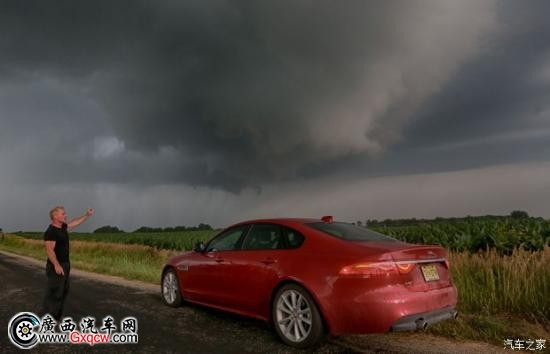 Tim Baker駕駛著捷豹XF四驅版車型在距芝加哥西面地區(qū)兩小時車程之處,遭遇了EF0級龍卷風(風速達60-70英里/小時)。風暴卷起雜物漫天飛舞,隨之而來的傾盆大雨淹沒了道路,但捷豹XF仍成功征服了泥濘不堪的道路和積水濕滑的公路。
