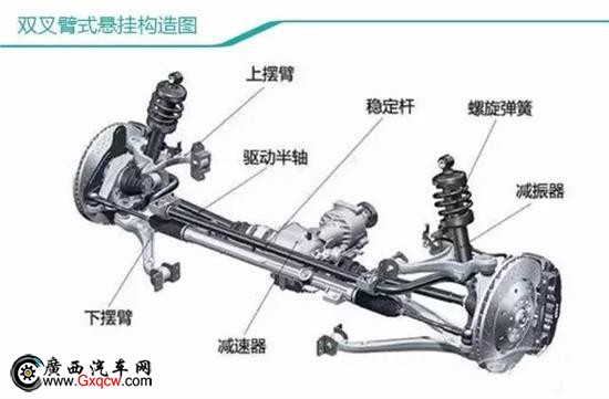 雙叉臂式懸掛(雙A臂、雙橫臂式懸掛),可理解為在麥弗遜式懸掛基礎(chǔ)上多加一支叉臂。車輪上部叉(擺)臂,與車身相連,車輪的橫向力和縱向力都是由叉臂承受,而這時(shí)的減振器只負(fù)責(zé)支撐車體和減振的任務(wù)。