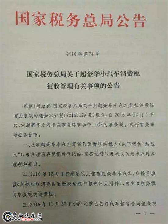 1月30日晚,財(cái)政部網(wǎng)站公布《關(guān)于對(duì)超豪華小汽車加征消費(fèi)稅有關(guān)事項(xiàng)的通知》。據(jù)國(guó)家稅務(wù)總局網(wǎng)站消息,財(cái)政部、國(guó)家稅務(wù)總局今日下發(fā)關(guān)于對(duì)超豪華小汽車加征消費(fèi)稅有關(guān)事項(xiàng)的通知。通知指出,對(duì)超豪華小汽車加征10%的消費(fèi)稅。