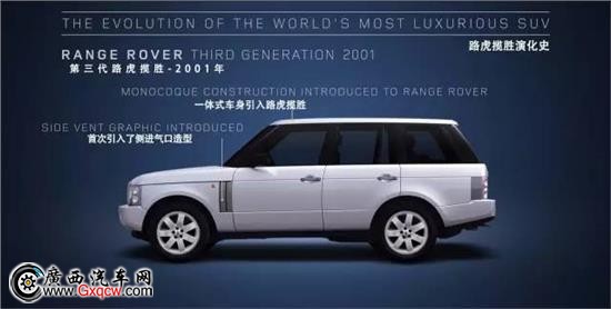 2001年,第三代路虎攬勝引入了側(cè)進(jìn)氣口造型和一體式車身設(shè)計(jì)