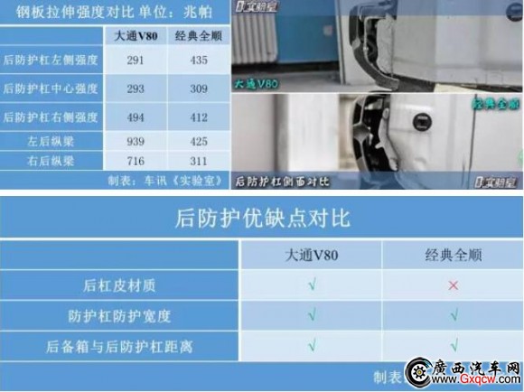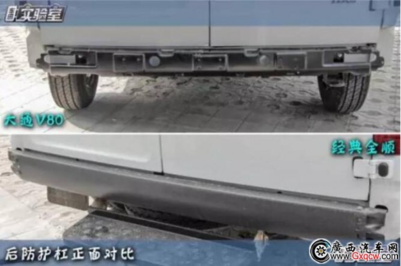 經(jīng)典全順后防護(hù)杠為鋼質(zhì)材料,橫向防護(hù)寬度約占車身寬度的95%,斷面為帽形形結(jié)構(gòu),防護(hù)杠長(zhǎng)寬高分別為1734mm*55mm*147mm,鋼板厚1.8mm;防護(hù)杠中心點(diǎn)垂直地面高520mm。