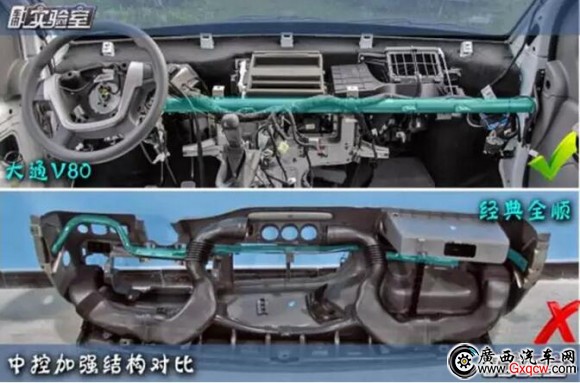 中控支撐桿就是藍(lán)色標(biāo)注部位,該零件主要承擔(dān)支撐中控部件的作用,換句話說(shuō),大部分零件固定依靠它為中心點(diǎn),好比大樹(shù)的主干。同時(shí)它也能起到車身側(cè)向加強(qiáng)與正面防護(hù)的作用。原則來(lái)說(shuō),大通V80和經(jīng)典全順的支撐桿連接方式都是沒(méi)有問(wèn)題的,但從強(qiáng)度以及整體布局來(lái)看,大通V80設(shè)計(jì)更為合理。
