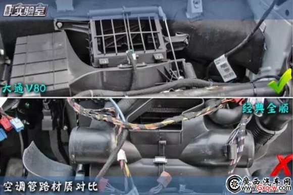 經(jīng)典全順?lè)墙饘賰?nèi)飾結(jié)構(gòu)以及空調(diào)管路壁厚比較薄,而且兩個(gè)空調(diào)管連接處密封性較差,沒(méi)有卡扣設(shè)計(jì)容易脫落。兩車在非金屬材料的選用上完全沒(méi)有可比性。
