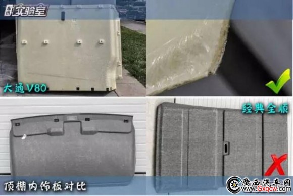 大通V80頂棚由前、中、后3塊組成,材料由裝飾層、中間板材、背部隔音層壓制而成。經(jīng)典全順內(nèi)飾板同樣由前、中、后3塊組成,材料方面與大通V80**的差異就是在表面裝飾層,大通V80采用即美觀又可擦洗的PVC表層,經(jīng)典全順使用的是無紡布,不易擦洗;從材料的選用方面,大通V80從客戶的切實情況考慮產(chǎn)品更加實用。