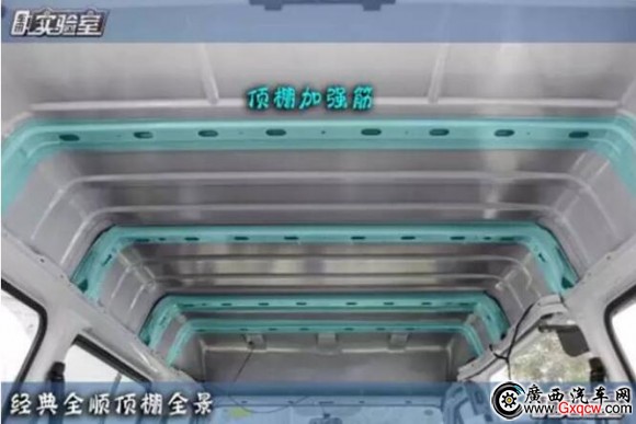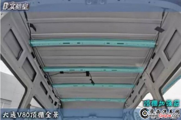 雖說兩車頂棚加強方式是雷同的,但一些細節(jié)還是不同的。我們仔細觀察頂棚兩側(cè)鋼板結(jié)構(gòu),明顯發(fā)現(xiàn)大通V80上側(cè)鋼板為雙層設(shè)計,做了比較全面的加強處理。