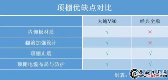 而經(jīng)典全順將一個頂殼簡單扣在了車身上。大通V80的這一設(shè)計可以更好的應(yīng)對車輛翻滾工況下的事故,尤其是作為校車的原型車,翻滾強度的考慮尤為重要。
