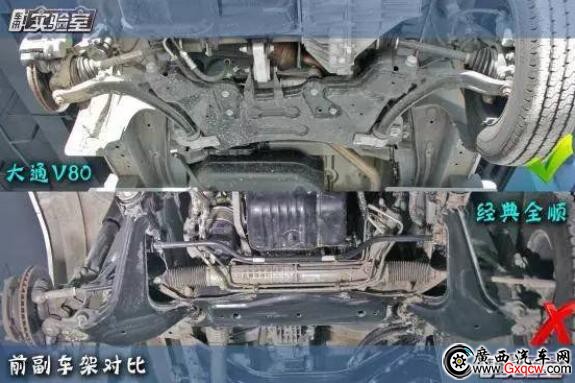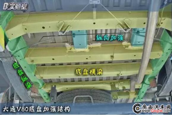 大通V80底盤兩側縱梁為貫穿式設計,這也是承載車身的共同特點,下圖黃色部位是車身底盤橫向加強結構,底盤加強橫梁與縱梁相結合,形成一個密集度較高的框架。無論是正面碰撞還是側面碰撞,碰撞力都能快速分散出去。在日常駕駛中我們也會有所體會,如此強悍的底盤加強結構還可以提高整車抗扭性。