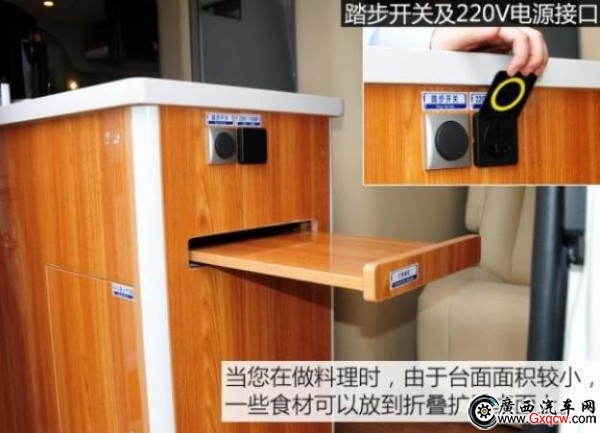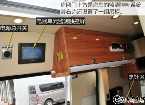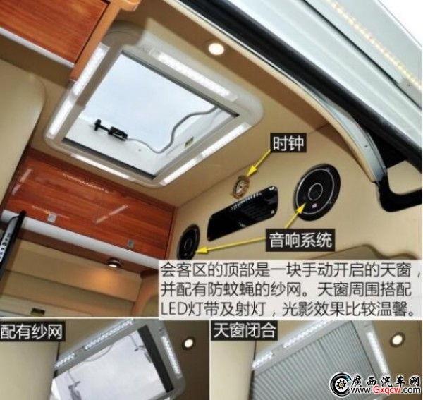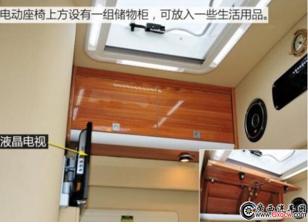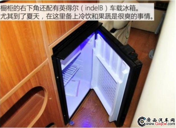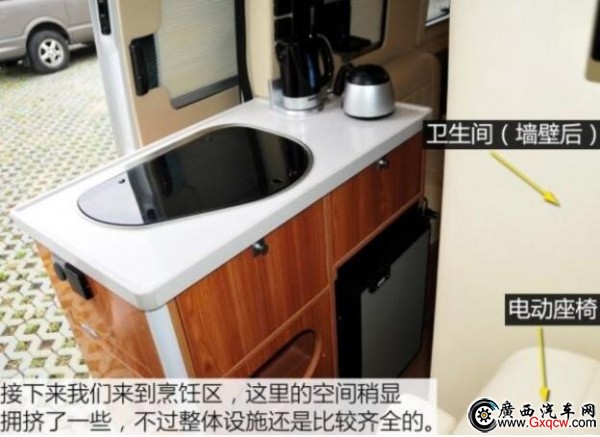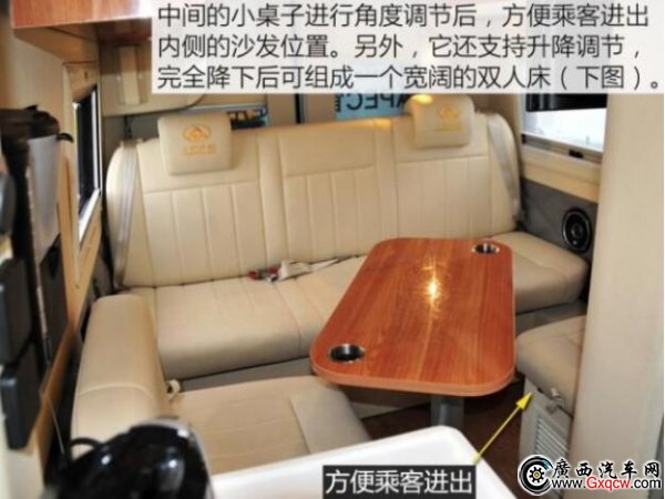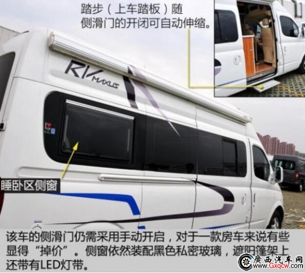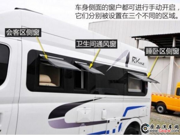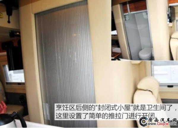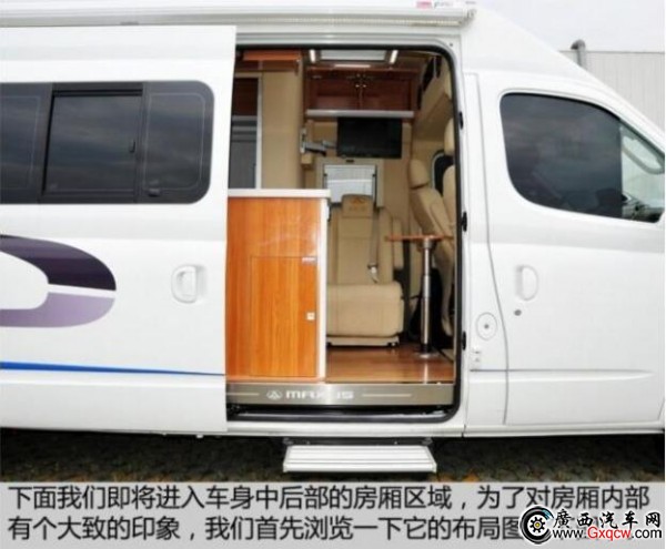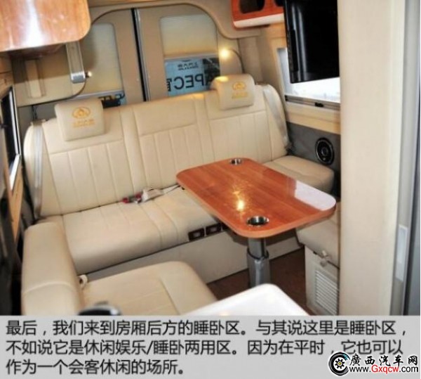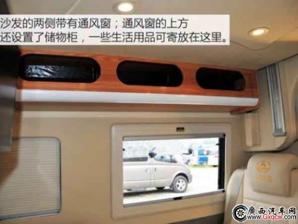 這款房車是將中后排的車廂直接當(dāng)作房廂而改造,也就是說,其駕駛艙與后部的房廂是一體相通的。