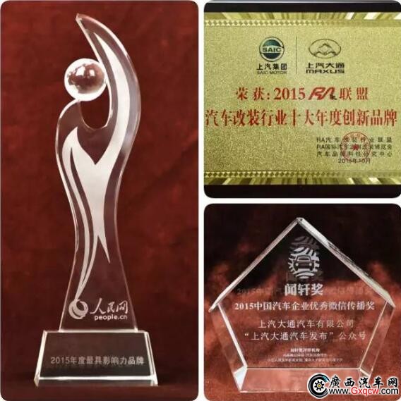 在人民網(wǎng)頒布的獎(jiǎng)項(xiàng)中,上汽大通獲得“2015年度最具影響力品牌”稱號(hào)。2015年,“上汽大通汽車發(fā)布”獲得汽車商業(yè)評(píng)論“2015聞軒獎(jiǎng)中國汽車優(yōu)秀微信傳播獎(jiǎng)”。此外,汽車品牌科技研究中心也將“2015年RA聯(lián)盟汽車改裝行業(yè)十大年度創(chuàng)新品牌”稱號(hào)授予了上汽大通。