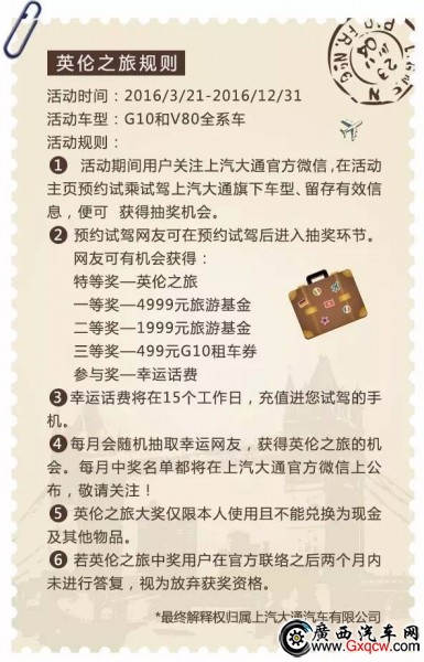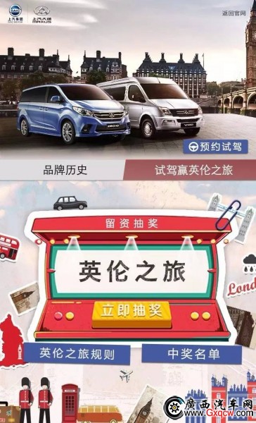 趕緊關(guān)注【上汽大通廣西澳馬】微信訂閱號,預約試駕就能參加抽獎哦!英倫之旅、豐厚的旅游基金和大禮等著你!