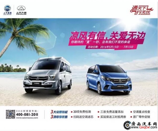 5月15日-7月15日期間,上汽大通在全國(guó)范圍內(nèi)開(kāi)展“夏季送清涼”活動(dòng)。活動(dòng)期間,上汽大通的新老車主均可前往服務(wù)商處,享受免費(fèi)車輛檢查和添加三液、掃碼送濾芯、配件優(yōu)惠促銷、買延保送工時(shí)券等“四重冰爽好禮”,為車輛出行增添一份清涼又安全的保障。