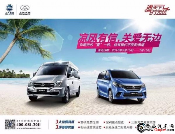 夏季到來,溫度升高,車輛的健康保養(yǎng)不可忽視?紤]到消費(fèi)者的切身需求,上汽大通將于5月15日-7月15日期間,在全國(guó)范圍內(nèi)開展“夏季送清涼” 活動(dòng);顒(dòng)期間,上汽大通的新老車主均可前往服務(wù)商處,享受免費(fèi)車輛檢查和添加三液、掃碼送濾芯、配件優(yōu)惠促銷、買延保送工時(shí)券等“四重冰爽好禮”,為車 輛出行增添一份清涼又安全的保障。