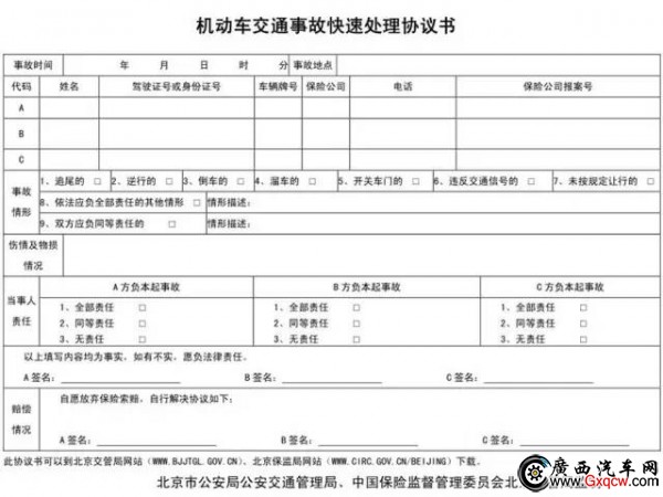 上圖就是你的法寶,機(jī)動(dòng)車交通事故快速處理協(xié)議書(以北京為例)。購(gòu)買車險(xiǎn)時(shí)附帶,交管局網(wǎng)站也可自行下載打印。