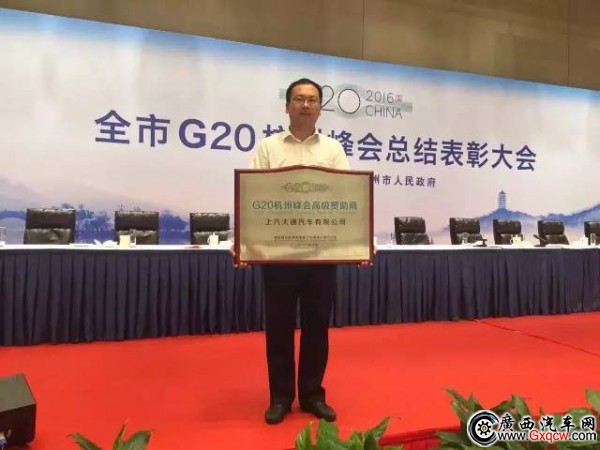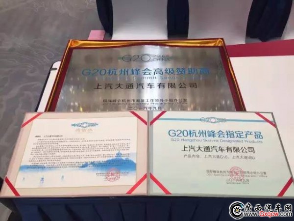 在表彰大會上,國際峰會杭州市籌備工作領(lǐng)導(dǎo)小組辦公室為上汽大通汽車有限公司辦法了【G20杭州峰會高級贊助商】的稱號獎項,并充分肯定了上汽大通V80與G10依靠其優(yōu)質(zhì)的性能與過硬的質(zhì)量為峰會做出的服務(wù)貢獻。