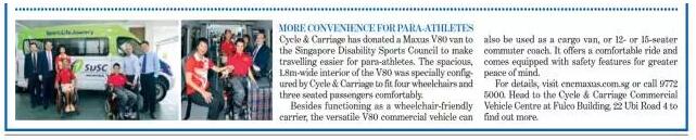 賽會(huì)結(jié)束后,上汽大通繼續(xù)無償為新加坡殘障人士運(yùn)動(dòng)委員會(huì)(Singapore Disability Sports Council)捐贈(zèng)V80無障礙車,用于接送運(yùn)動(dòng)員往返訓(xùn)練場(chǎng)地,使他們的生活、訓(xùn)練更為便捷。