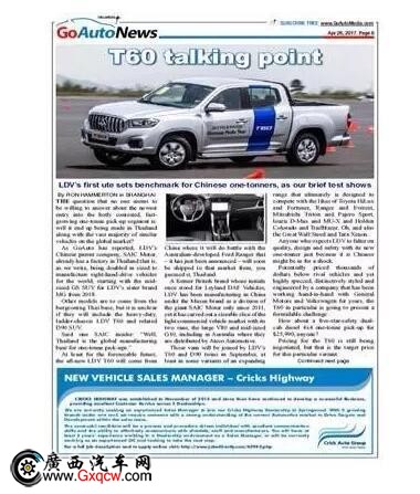 同時,他對上汽大通T60也進(jìn)行深度報道。報道中寫到:“上汽大通T60與D90將于今年9月于澳洲發(fā)布,它們的出現(xiàn)將打破原有人們對中國制造的產(chǎn)品質(zhì)量、設(shè)計、安全所存在的疑慮!