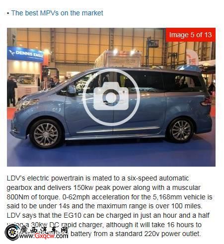 上汽大通在2017年伯明翰車展發(fā)布了豪華電動版MPV EG10,他的市場競爭對手是大眾凱路威。EG10繼承了一個G10的寬敞的內(nèi)室空間,可供七個成人乘坐。配備安全高效的大容量電池,1.5小時即可充滿,大功率永磁同步電動機(jī),峰值功率150kW,峰值扭矩800N.m。在上汽大通的計劃中,零排放的EG10將被用作城市出租車、機(jī)場使用和學(xué)校通勤。