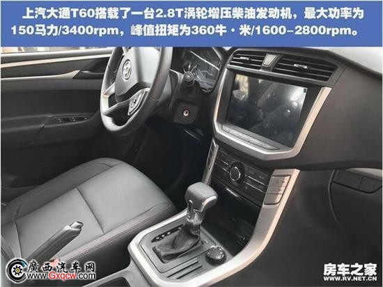 上汽大通T60搭載了一臺(tái)2.8T渦輪增壓柴油發(fā)動(dòng)機(jī),*大功率為150馬力/3400rpm,峰值扭矩為360!っ/1600-2800rpm。傳動(dòng)系統(tǒng)有5MT、6MT和6AT三種不同的變速箱,這款房車是6AT車型。