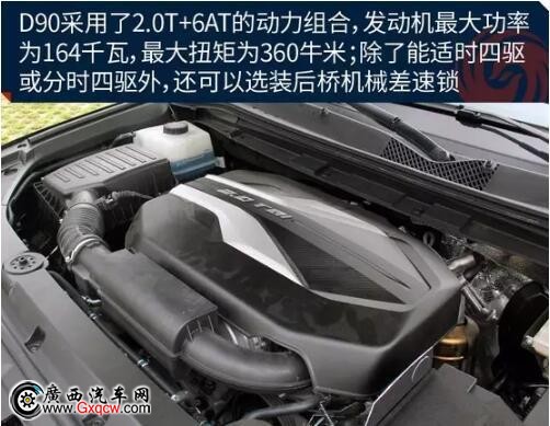大通D90目前全系車型均搭載的是2.0T渦輪增壓發(fā)動機(jī),*大功率為164千瓦,*大扭矩為360牛米,光從從參數(shù)來看,這臺發(fā)動機(jī)在自主品牌車型中,數(shù)據(jù)屬于中等偏上的水平。